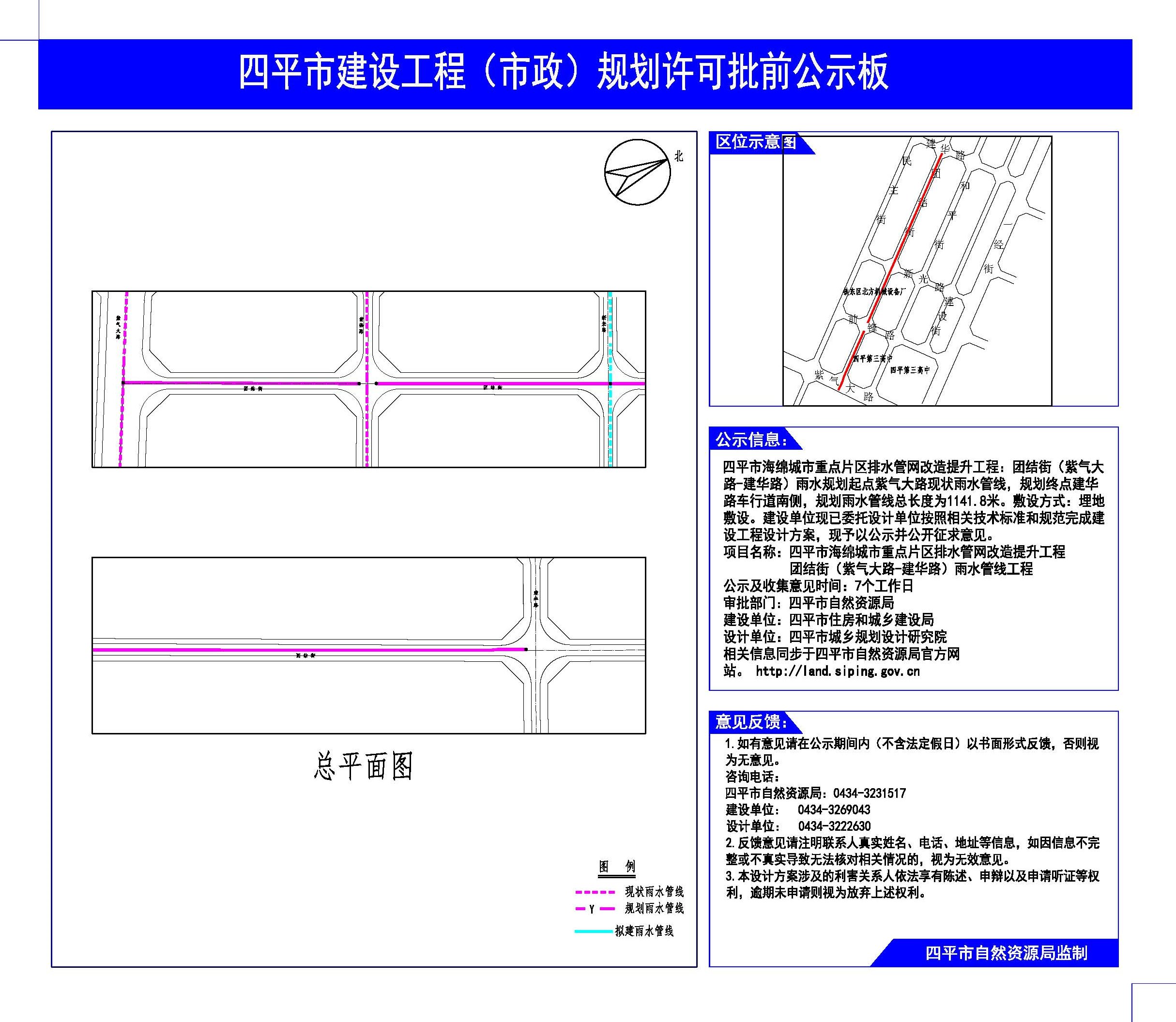 四平市海绵城市重点片区排水管网改造提升工程(团结街、和平街)项目,位于四平市区。建设单位已按照相关技术标准和规范完成建设工程设计方案,我局依四平市住房和城乡建设局关于四平市海绵城市重点片区排水管网改造提升工程(团结街、和平街)项目的申请,按照《中华人民共和国城乡规划法》、《中华人民共和国行政许可法》、《吉林省城乡规划条例》等有关法律法规要求,现予以公示并公开征求意见。具体设计指标详见公示总平面图。